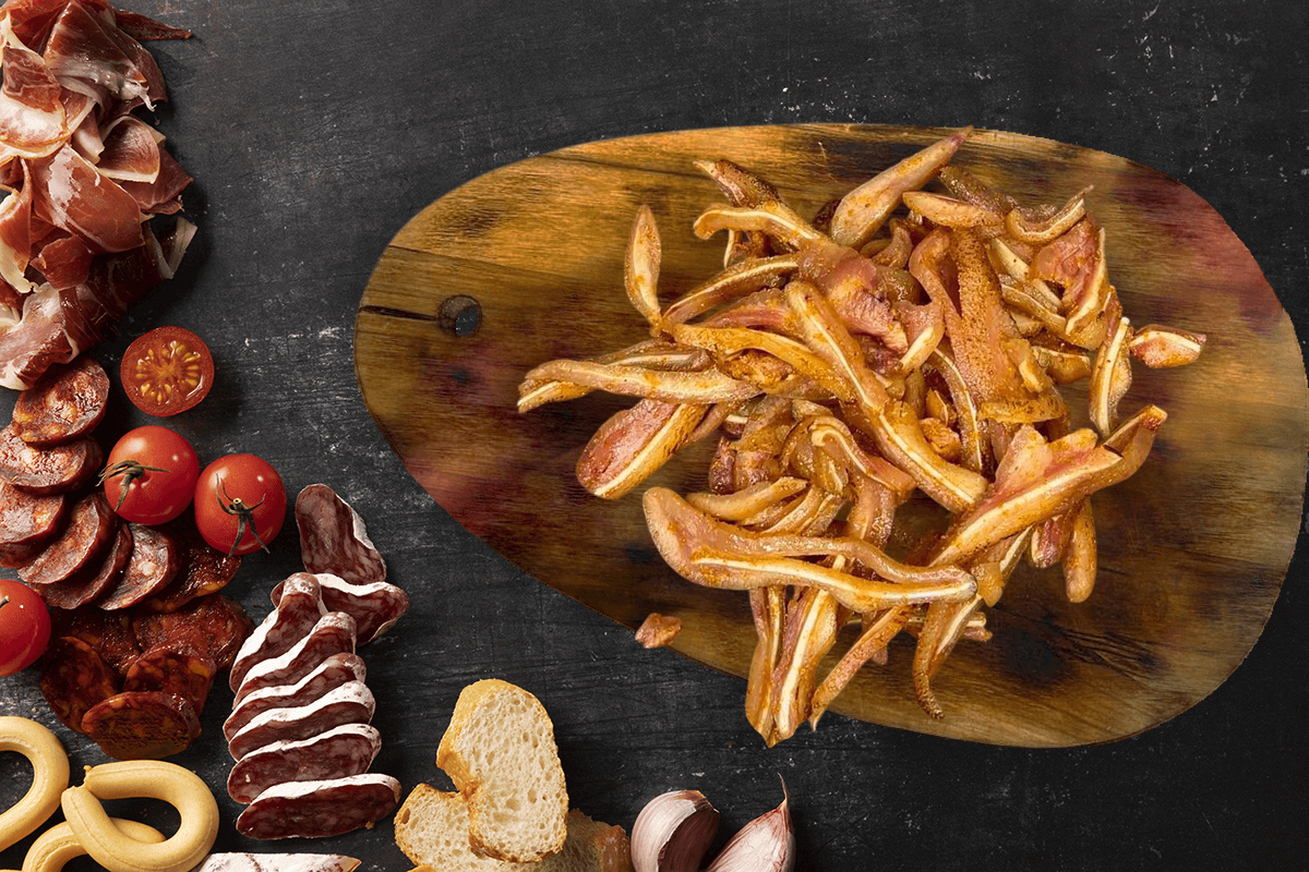 Склад: вуха свині нарізані, сіль, часник, цукор, соєвий соус, олія, коріандр, оцет, цибуля сушена, перець солодкий, сіль нітритна, Е621